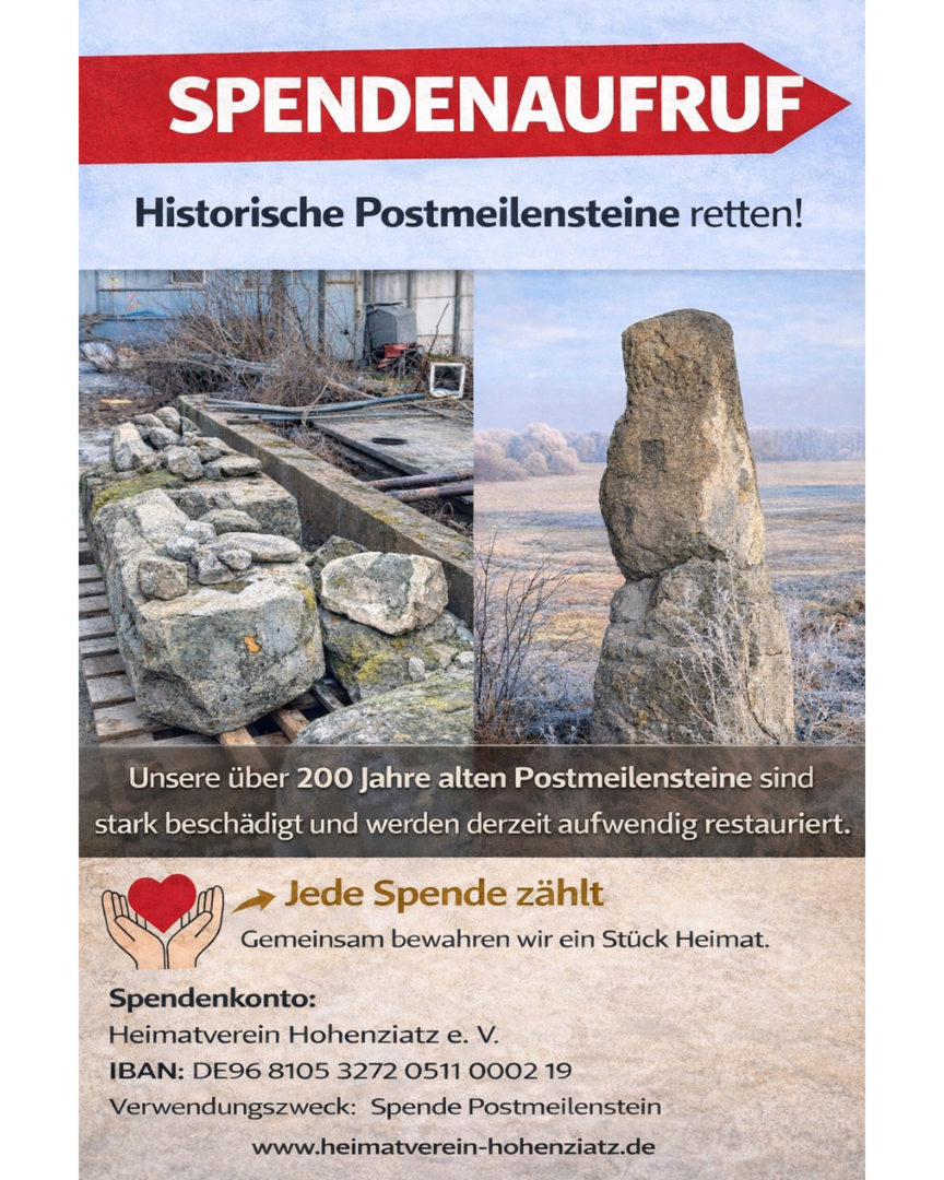 Historische Postmeilensteine retten! Unsere über 200 Jahre alten Postmeilensteine sind stark beschädigt und werden derzeit aufwendig restauriert. Die Wiederaufstellung ist für den 06.06.2026 geplant. Jeder Euro unterstützt den Heimatverein Hohenziatz